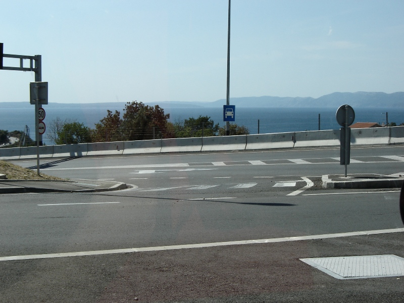 Ţac-ţac, zoom-zoom, pân-au luat-o ameţelile şi puiul de la KFC-ul de-acasă a-nceput să-i dea din aripi şi copane în gât. Opreşte la o benzinărie. Ia o cafea, alimentează, fumează o ţigară-două, spală parbrizul de cadavrele insectelor pe care ştergătoarele nu mai făceau faţă să le cureţe. Apoi treci de Zagabria/Zagreb şi-ndreaptă-te spre Rijeka, altă piată de hotar. „S-aveţi grijă acolo când vă zice GPS-u’ s-o luaţi la dreapta, să nu cumva să intraţi în oraş, că nu mai ieşiţi cu una, cu două”, ne-au avertizat nişte prieteni care-o păţiseră înainte. Ce, noi s-o luăm pe unde nu trebe? Never. Şi-am luat-o pe unde nu trebuia. Şi-am ajuns taman pe străduţele înguste ale Rijekăi, şi-am întrebat noi localnicii cam cum s-ar putea ieşi spre, scuzaţi, Pula, şi ei ne-au explicat şi noi am avut impresia că am înţeles, dar ne-am trezit la un moment dat în creierul munţilor, cu marea departe-departe. Dar să pun şi o poză de când am văzut totuşi marea: