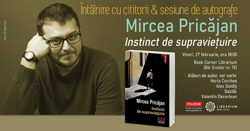 Vineri, 27 februarie, ora 18:00, la librăria Book Corner Librarium (Bd. Eroilor 15), va avea loc lansarea volumului Instinct de supraviețuire de Mircea Pricăjan, apărut de curând în colecția „Ego. Proză” a Editurii Polirom.