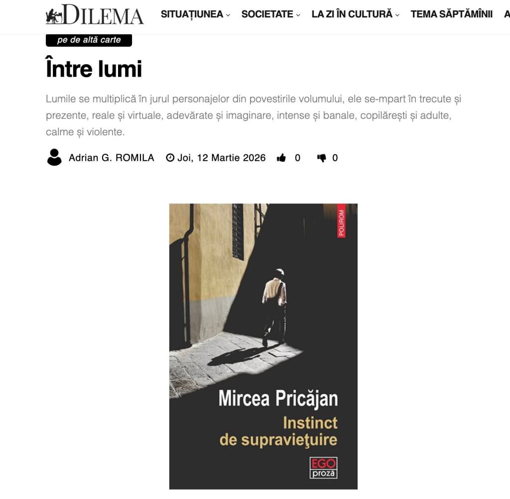 În nr. 104/2026 al revistei Dilema, Adrian G. Romila semnează o cronică a volumului Instinct de spraviețuire (Polirom, 2025).