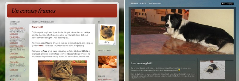 Nu ştiu dacă voiau să se afle, dar eu i-am surprins astăzi butonând tastatura, când unul, când celălalt, şi uite că acum, când s-a eliberat locul din faţa calculatorului, nu mă rabd să nu vă anunţ minunea. Cotoiaşul Axi şi BorderCollie-ul Ares, bloggeri de altfel vechi, s-au reapucat de treabă. Zic ei că a venit din nou momentul, că lunga pauză a luat sfârşit şi că de-acum ne putem aştepta din partea lor la o activitate blogheristică susţinută. (Şi-au înnoit chiar şi blogurile! Mie-mi par mândre aşa.)