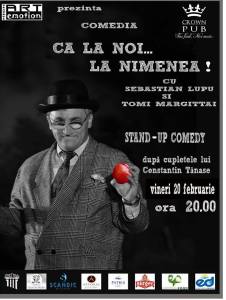 Spectacolul Ca la noi… la nimenea!, în organizarea trupei orădene ArtEmotion, în care actorul Sebastian Lupu îl readuce aproape întocmai la viaţă pe Constantin Tănase, mi-a prilejuit o binevenită și foarte plăcută scufundare în acest paradox. Nu e de mirare, astfel, că acest spectacol cu oarecare vechime deja în orașul de pe malul Crișului Repede continuă să umple sălile pub-urilor unde este prezentat. Eu l-am văzut în incinta proaspăt renovată a Crown Pub-ului, local aflat la parterul Hotelului Astoria, restaurat și el, o superbă clădire ridicată în 1902 de arhitectul Ferenc Sztarill, același care a proiectat și Palatul Vulturul Negru. Locul, cu arhitectura și trecutul său, a venit în întâmpinarea jocului inspirat al lui Sebastian Lupu, aducând astfel, deloc paradoxal, trecutul în prezent. Căci numai despre un salt în trecut nu poate fi vorba în cazul acestui show. Construit pe textele clasice ale lui Tănase, modificate extrem de puțin, spectacolul reușește să binedispună în doză justă, în vreme ce accentul principal pare a cădea, cât se poate de corect, pe latura moralizator-tristă. Susținut muzical de Tomi Margittai, Sebastian Lupu reușește performanța de a intra în personaj destul de repede: își reglează debitul verbal, își controlează mai bine expresiile faciale, intră în joc cu publicul, căruia îi intuiește dinamica, accentuând apoi acele părți din partitură care să aibă mai mare efect. Rolul îi vine mănușă, iar el o știe și se folosește abil de unul dintre auurile sale: vocea inconfundabilă, pe care o modulează credibil când în falsetto, spre finalul versurilor cu „poantă”, când într-o răgușeală plângăreață, ambele aducându-i pe loc aplauzele celor din sală. Să susții vreme de o oră și jumătate un monolog în versuri atât de dificil, străduindu-te în același timp să nu ieși dintr-un personaj cunoscut, cu atâtea note caracteristice cum a fost Constantin Tănase, nu e deloc ușor, iar actorului nostru îi reușește fără efort vizibil, încheind spectacolul (cu un epilog foarte bine ales) nu vlăguit, încurcând cuvintele, renunțând la gesticulația de susținere, ci chiar cu mai multă vervă decât la început. La ieșirea din joc, trecând printre spectactori, a părut că nu face decât să mute scena în cealaltă parte a sălii.