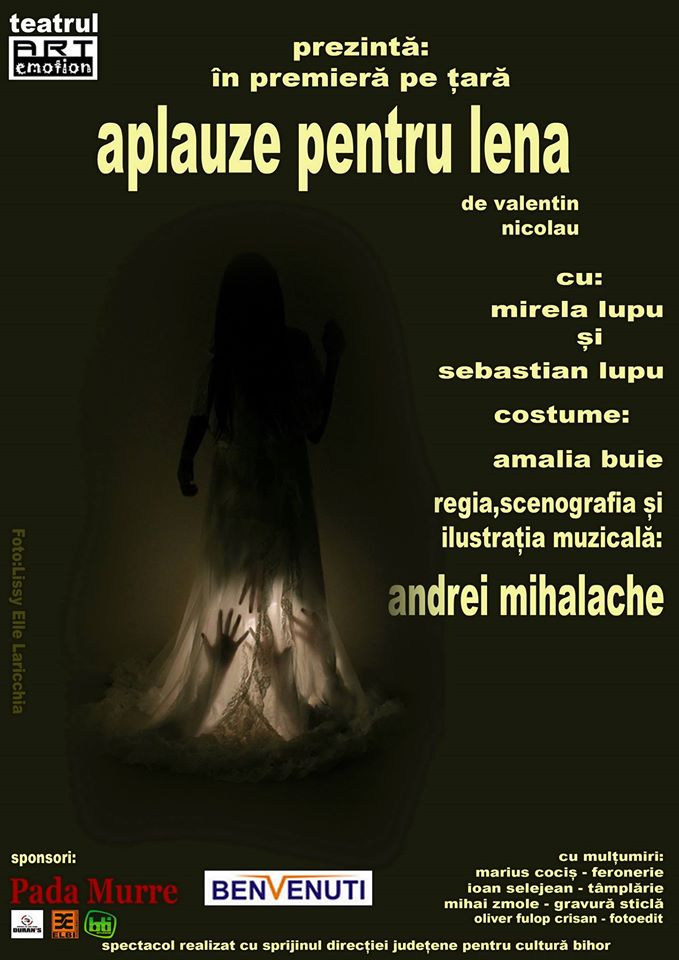 Totuși, publicul orădean a avut ocazia să își arate interesul pentru teatrul lui Valentin Nicolau o oră și jumătate mai târziu, când, la Crown Pub, trupa ArtEmotion a prezentat în premieră pe țară montarea piesei Aplauze pentru Lena. Sala restaurantului proaspăt renovat (vechiul Astoria) a fost arhiplină, locurile fiind ocupate, ne-au spus organizatorii, încă dinainte ca spectacolul să fie anunțat public (motiv pentru care nici nu a mai fost anunțat după cutumă, pentru rezervări, ci doar ca eveniment cultural). Acest lucru nu ne miră, căci spectacolele trupei ArtEmotion s-au jucat întotdeauna cu… pub-ul plin. Noul spectacol a fost însă o provocare atât pentru organizatori, cât și pentru spectatori. În regia inspirată a lui Andrei Mihalache, Aplauze pentru Lena nu este nicidecum o comedie, așa cum trupa manageriată de Mirela și Sebastian Lupu și-a obișnuit publicul, este o dramă care invită la analiză de sine, iar unele scene, cum ar fi monologul fostei actrițe de succes Elena, ajunsă acum aidoma unei păsări cu penajul fanat, prizonieră într-o colivie în care a intrat în culmea gloriei orbită de strălucirea zăbrelelor, sunt de-a dreptul cutremurătoare. Mirelei Lupu îi reușește un personaj deosebit de puternic în deriva lui, reușind să îmbine tăria de caracter cu pierderea de sine. La fel, Sebastian Lupu face un Dinu aparent superior-înfumurat, în realitate iscoditor și interesat de recentul său câștig la cărți (Elena) mai mult decât vrea să lase să se vadă. Interpretarea celor doi – o oscilație continuă, ca un dans sincopat în care partenerii preiau conducerea pe rând, când intuiesc la celălalt un moment de slăbiciune – este ajutată de scenografia bine adaptată la decorul de pub, dar și de costumele realizate de Amalia Buie. O partitură sobră, așadar, un pariu pe care aplauzele prelungi i-au anunțat pe organizatori că l-au câștigat. Cu siguranță, Aplauze pentru Lena va deveni una dintre, dacă nu chiar cea mai jucată piesă din repertoriul ArtEmotion în anii care vor veni. Și, nu în ultimul rând, este și va fi bucuria și mândria noastră că premiera pe țară a avut loc la Oradea.